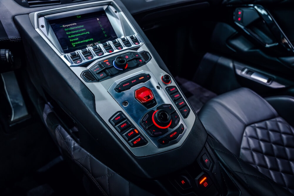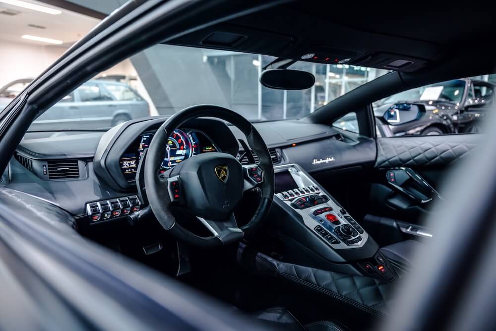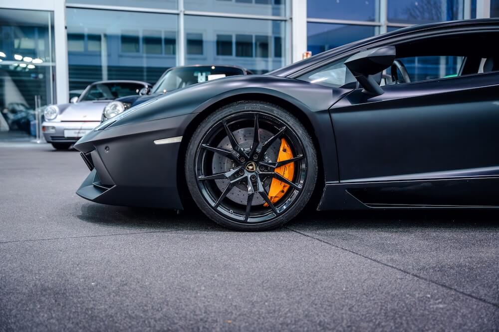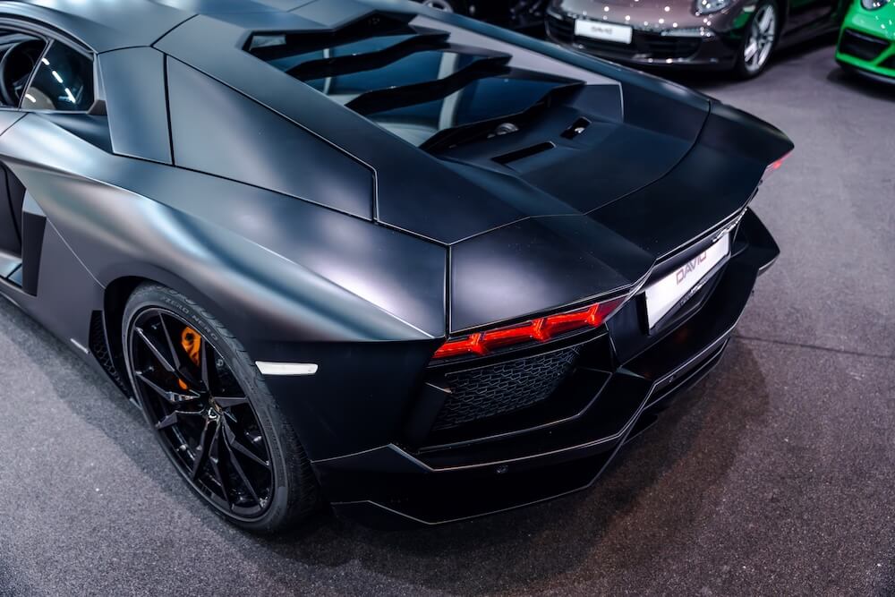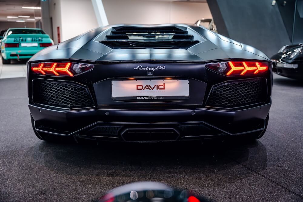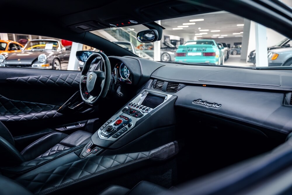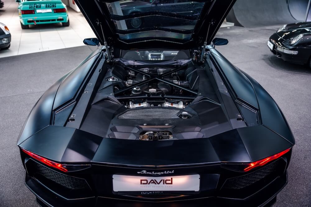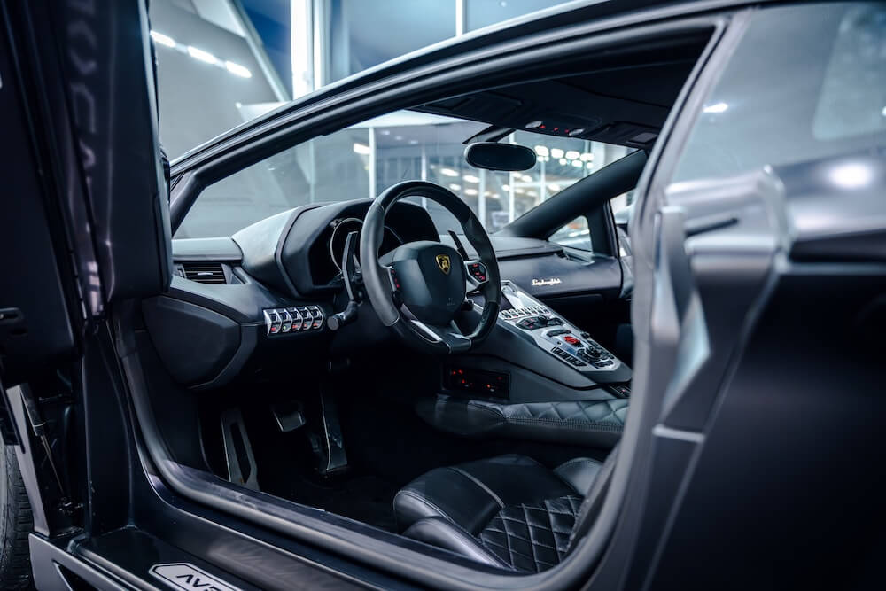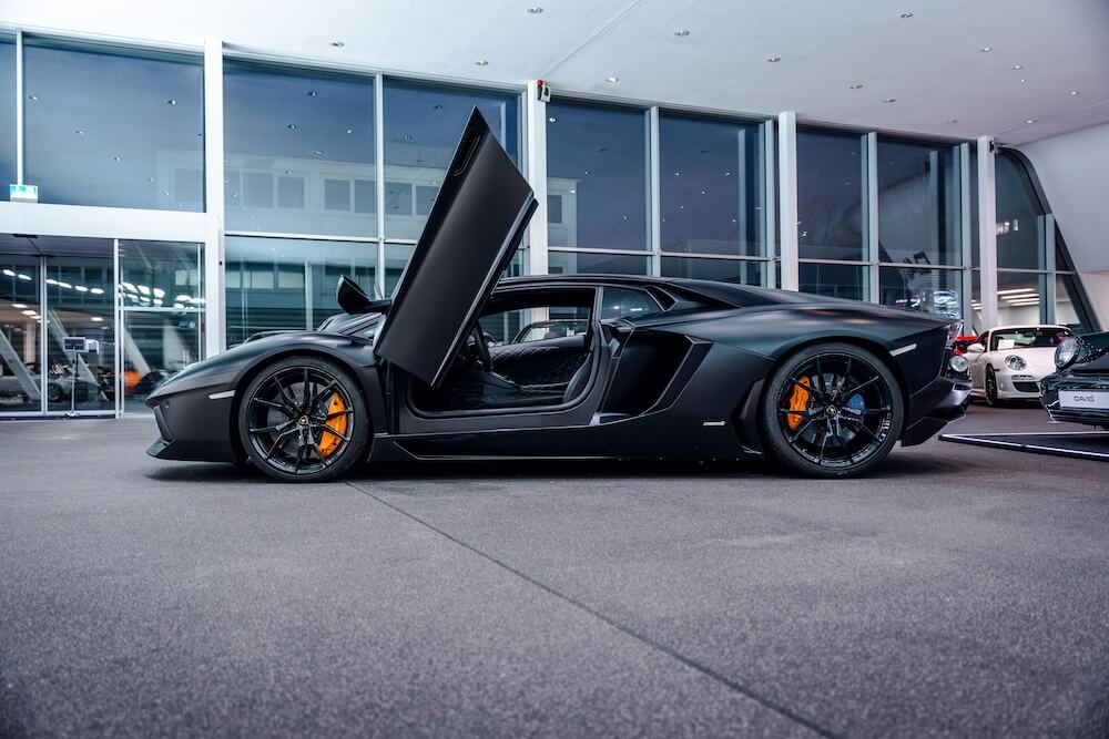 Wunderschöner Lamborghini Aventador in Matt-schwarzem Lack ab Werk in klassischer Farbkombination.