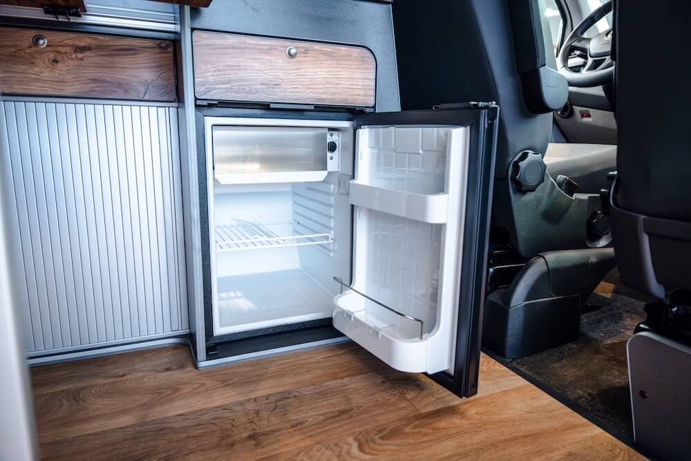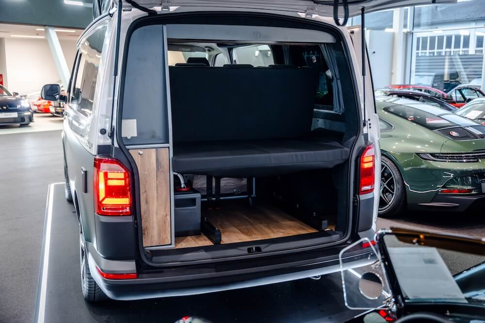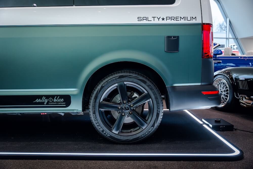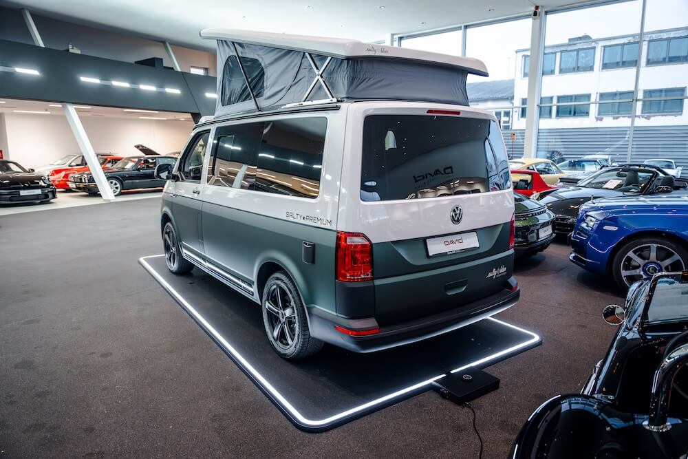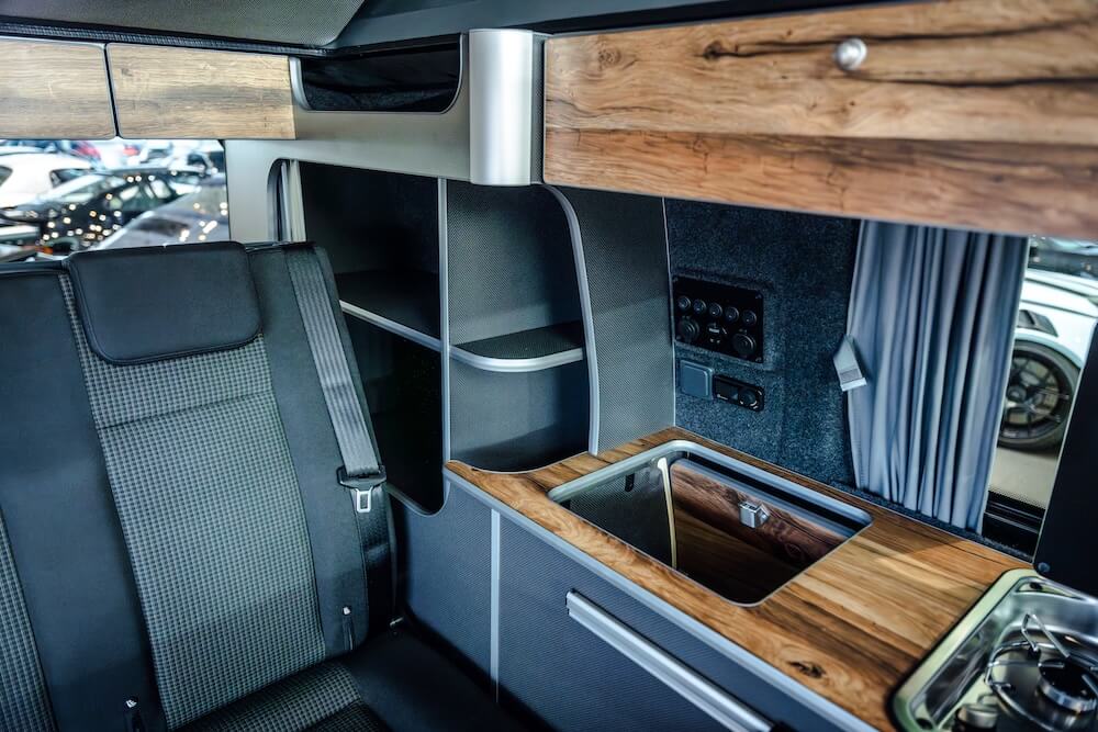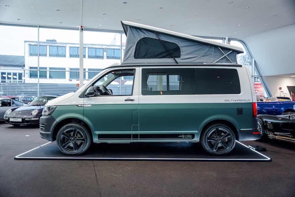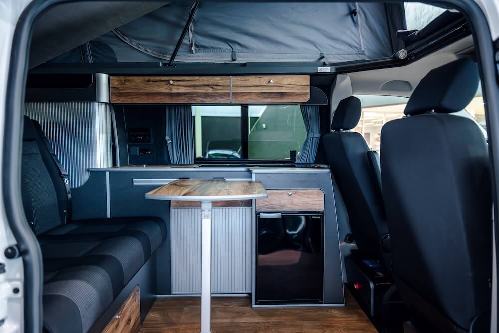 Ein von Salty Blue umgebauter VW Transporter, mit Kühlschrank, Aufstelldach und vielen Holzelementen.