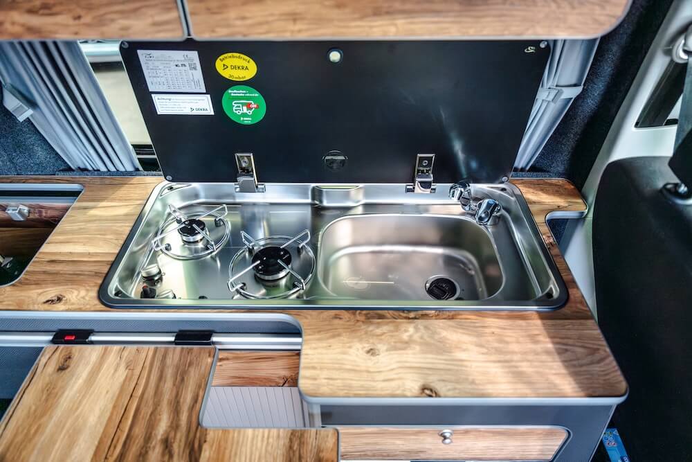 - Küchenzeile mit zweiflammigem Gasherd, Spüle mit integriertem Wassersystem